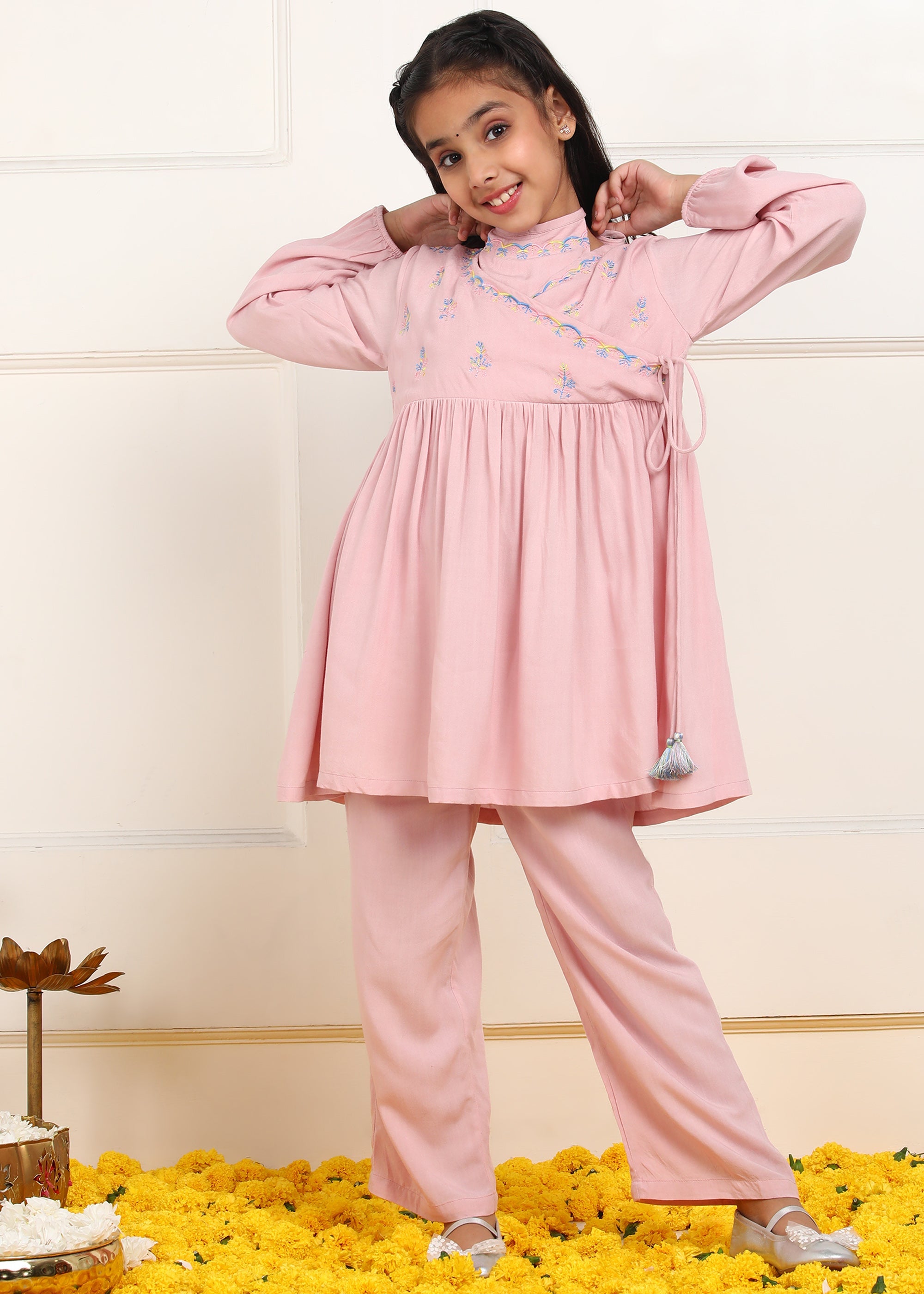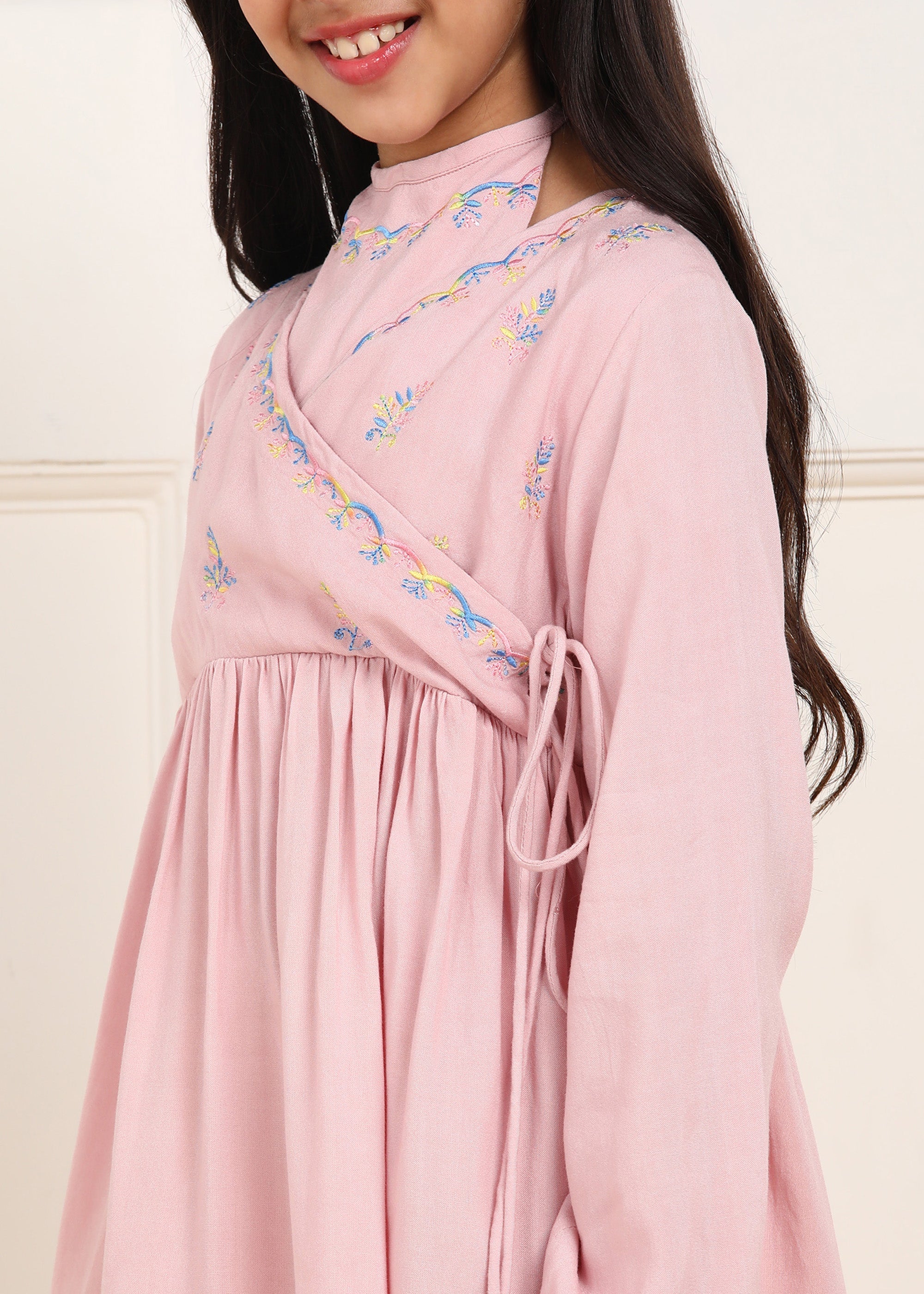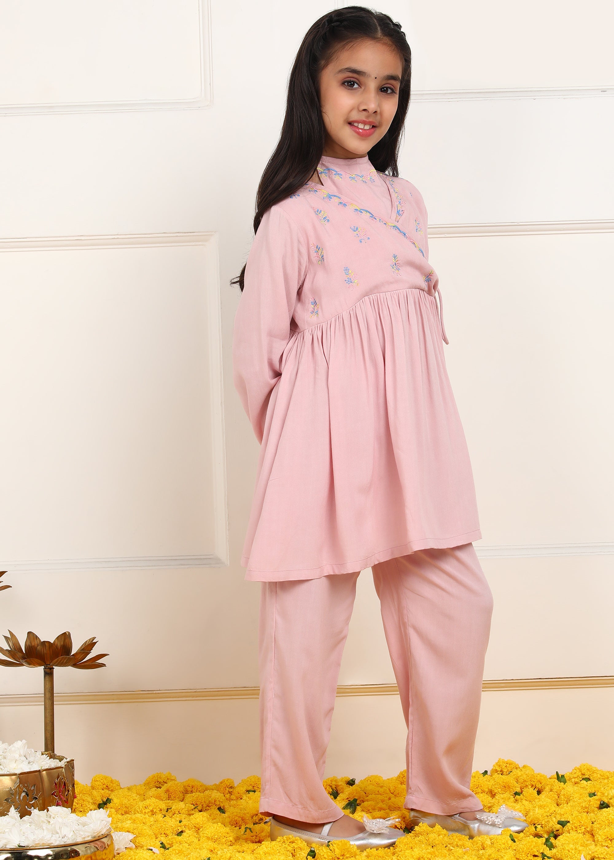 Julie Girls Floral Embroidered Kurta & Trouser Set - Pink