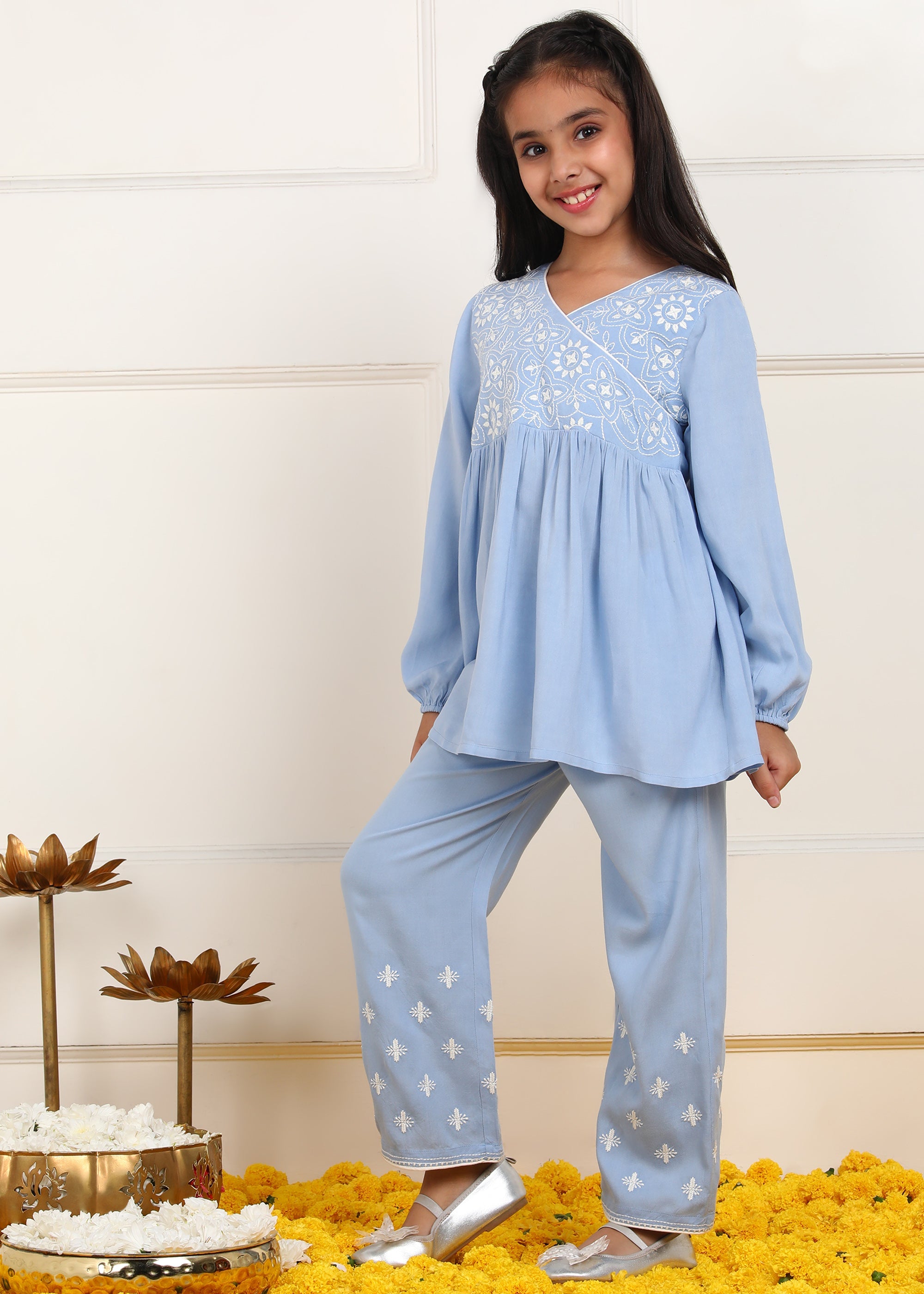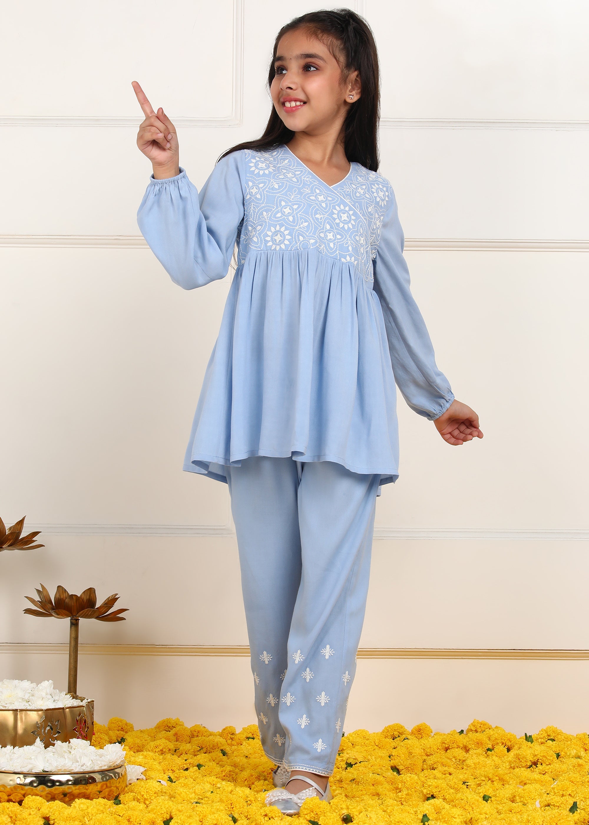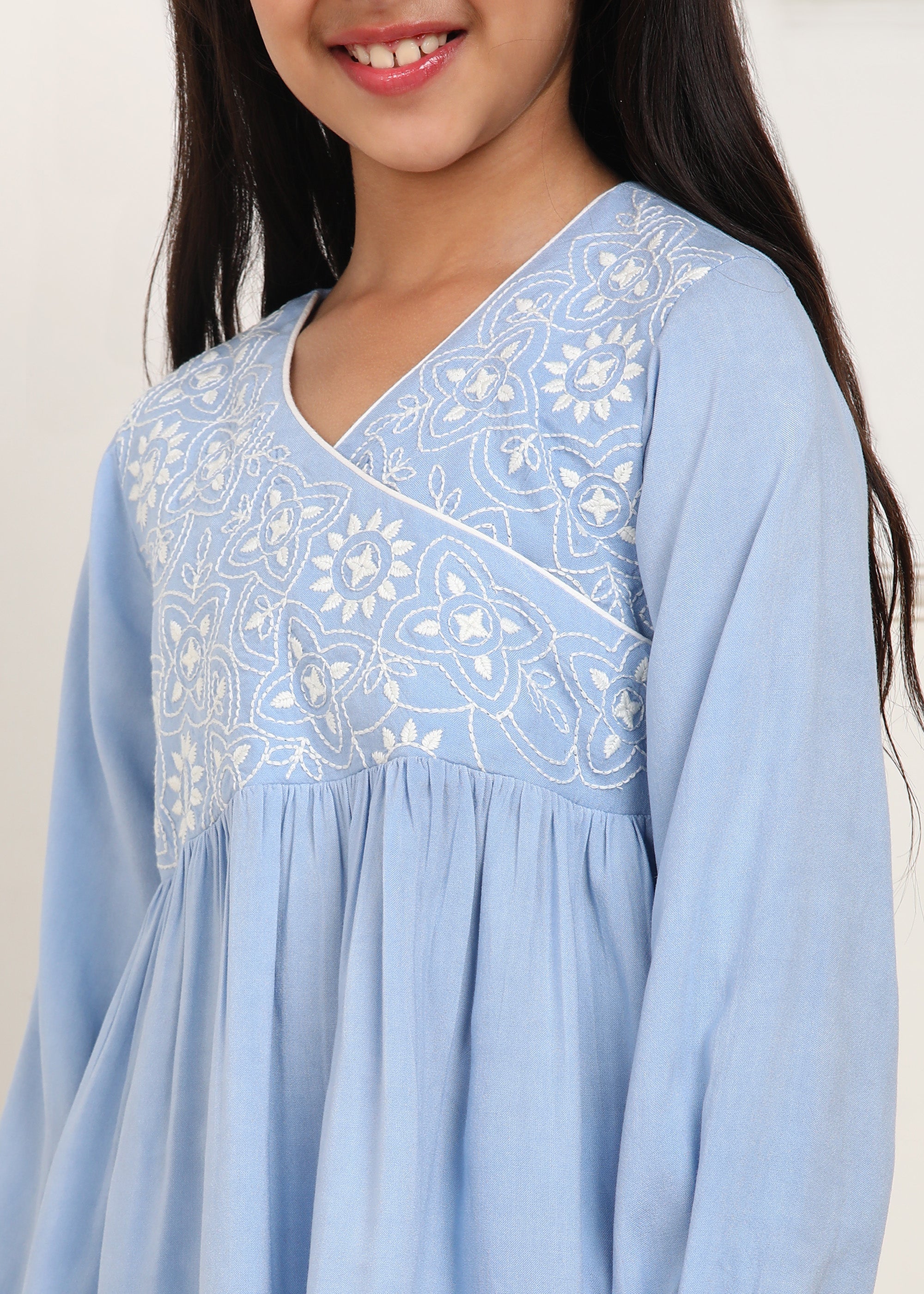 Nitya Girls Floral Embroidered Kurta With Trousers - Blue