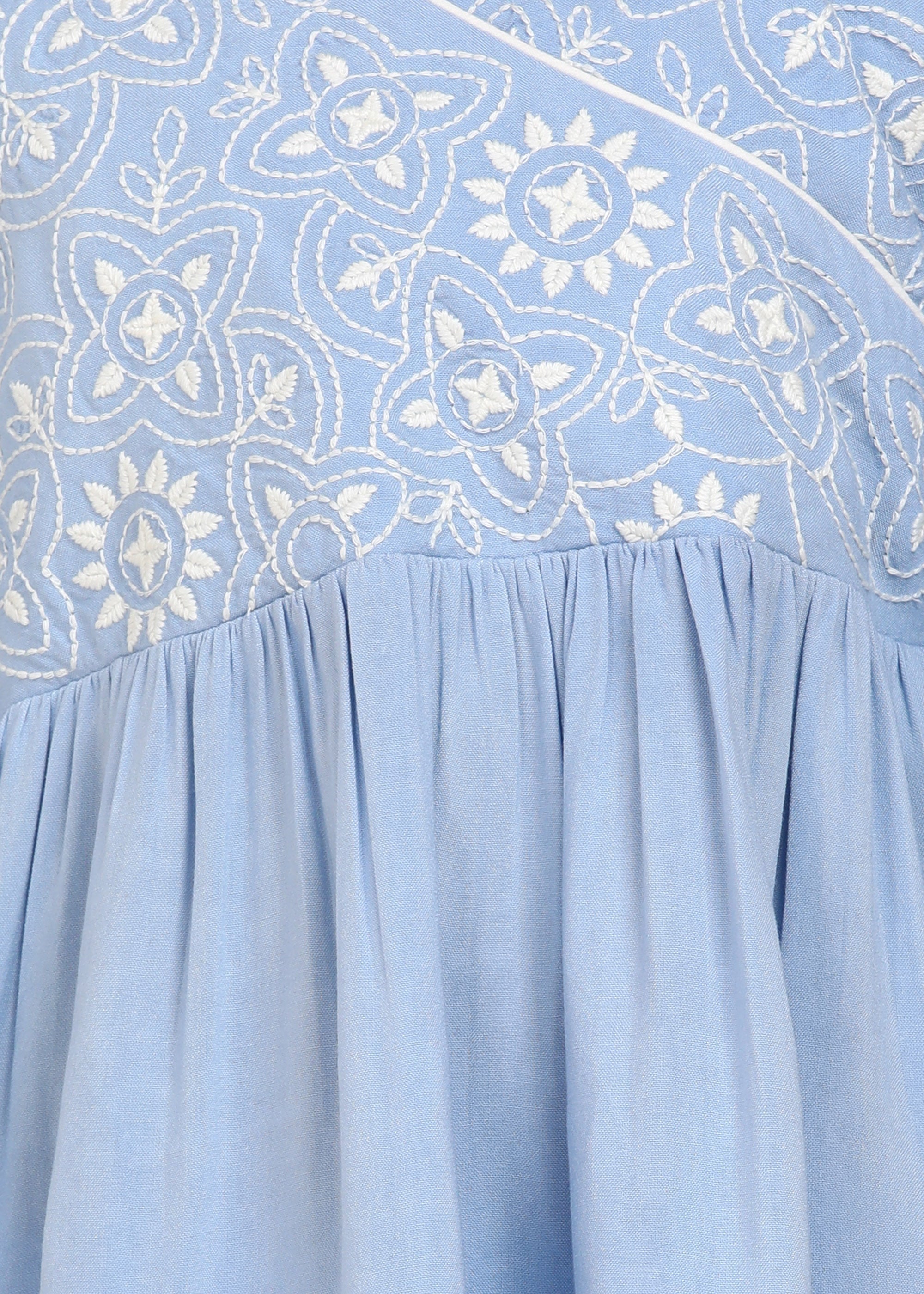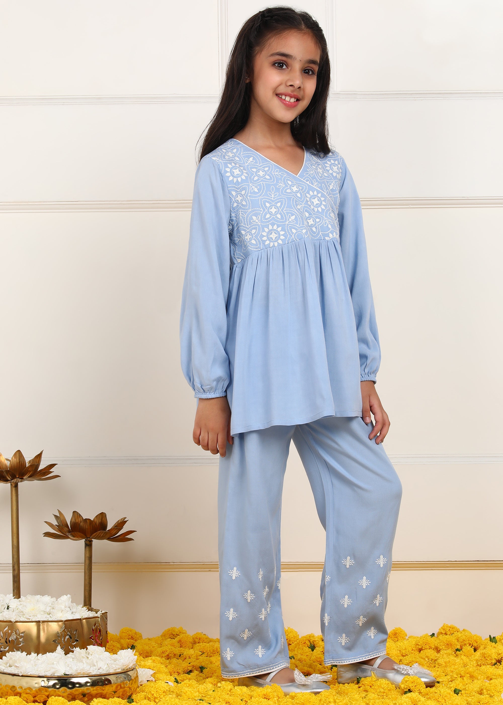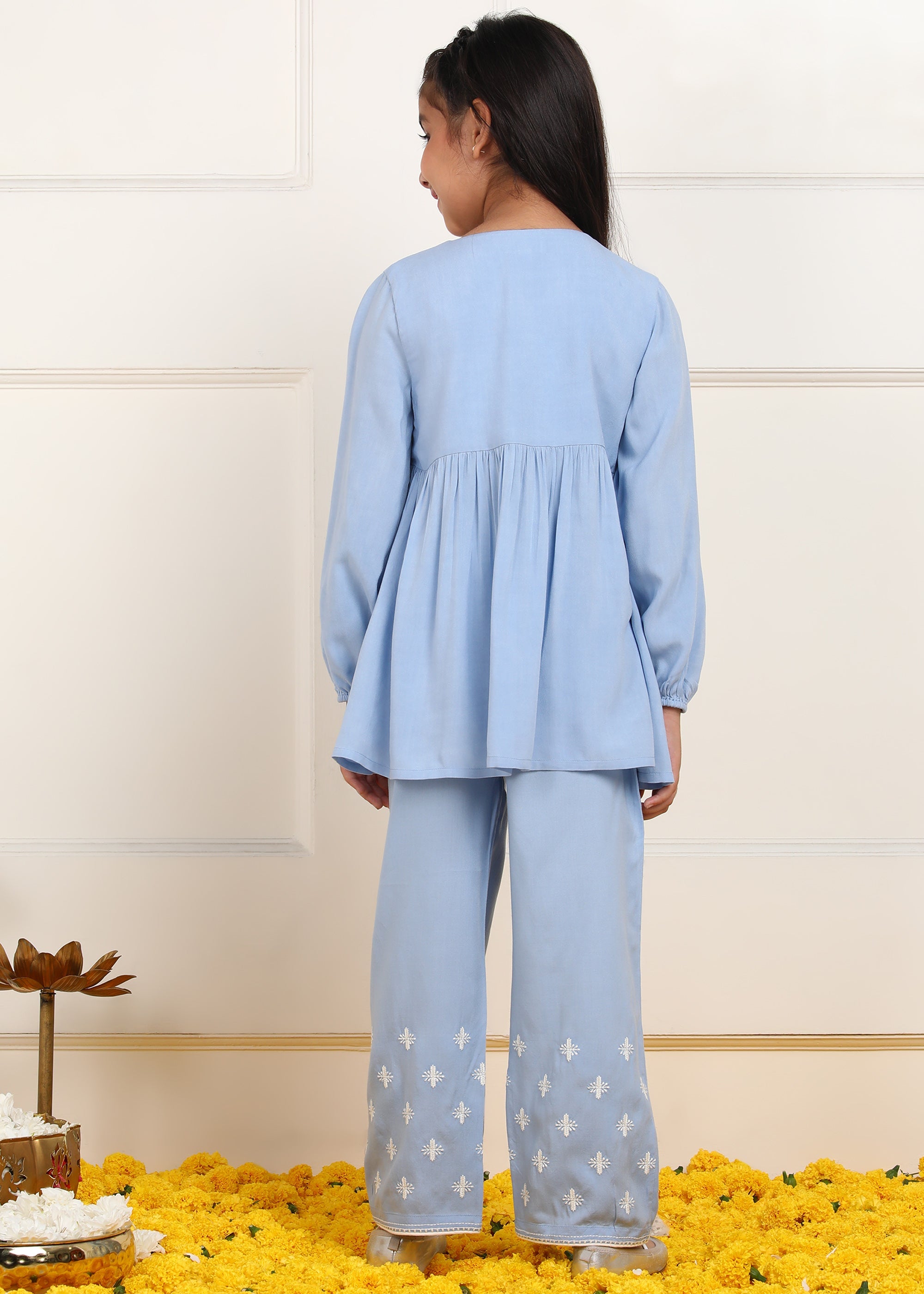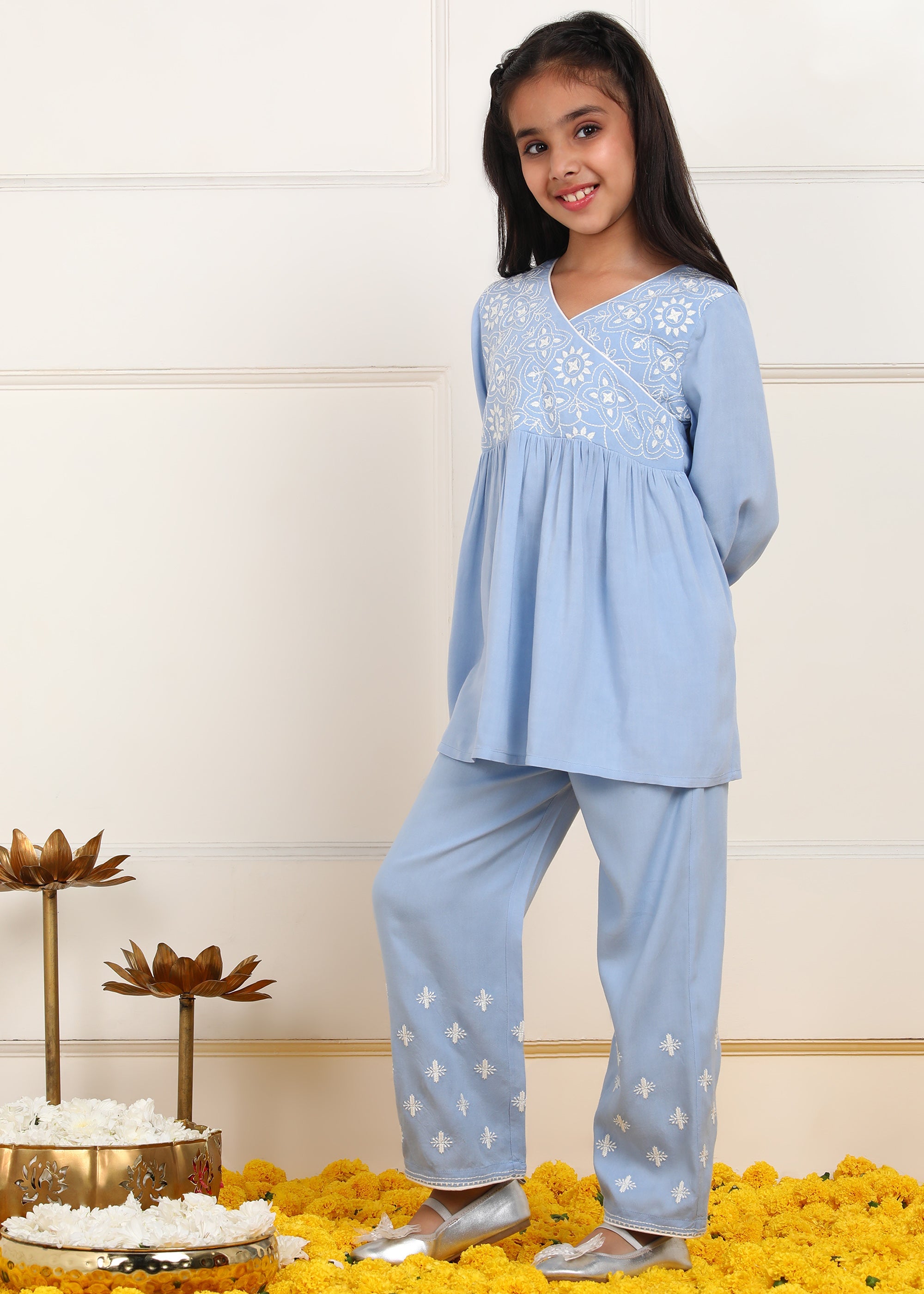Nitya Girls Floral Embroidered Kurta With Trousers - Blue