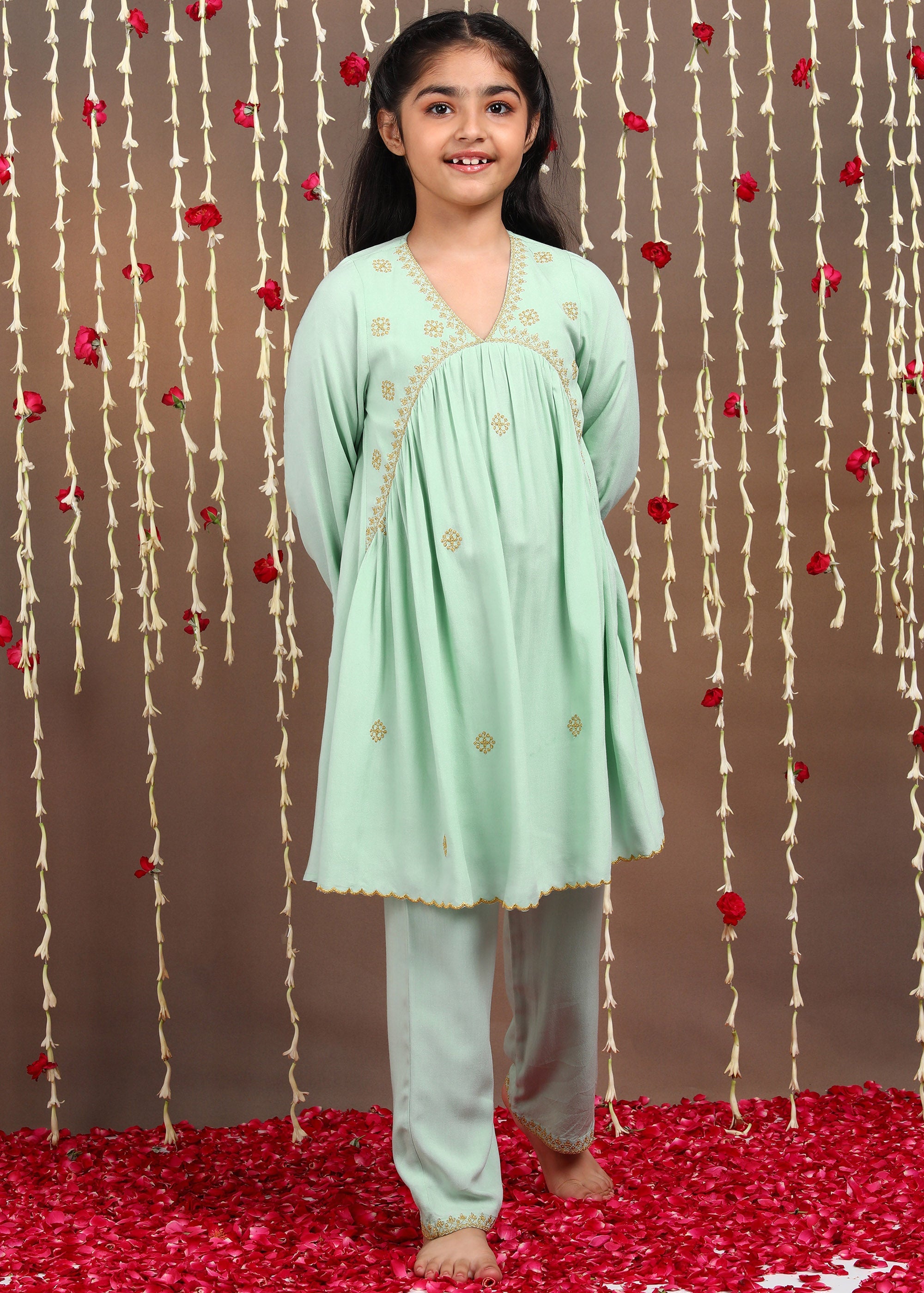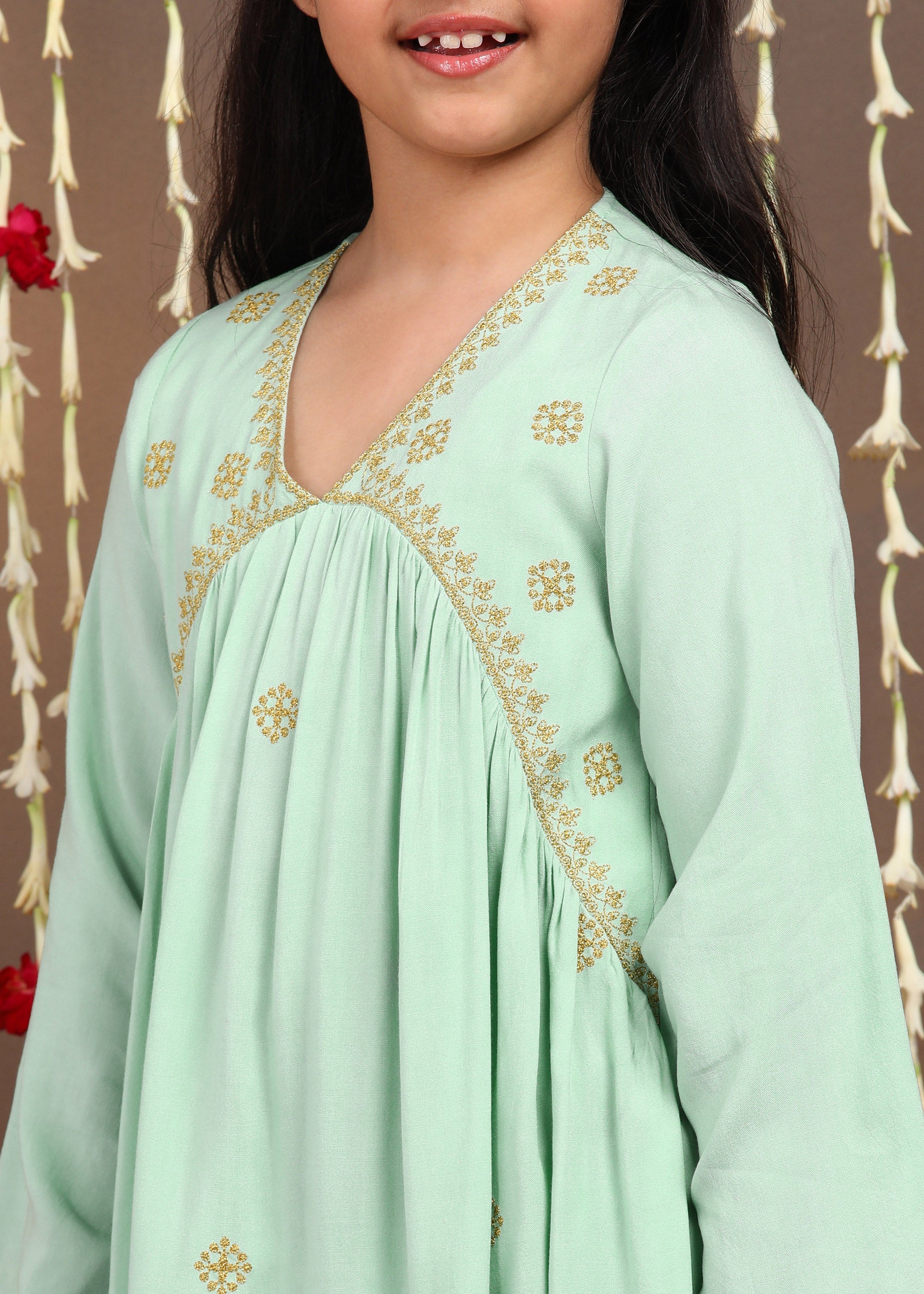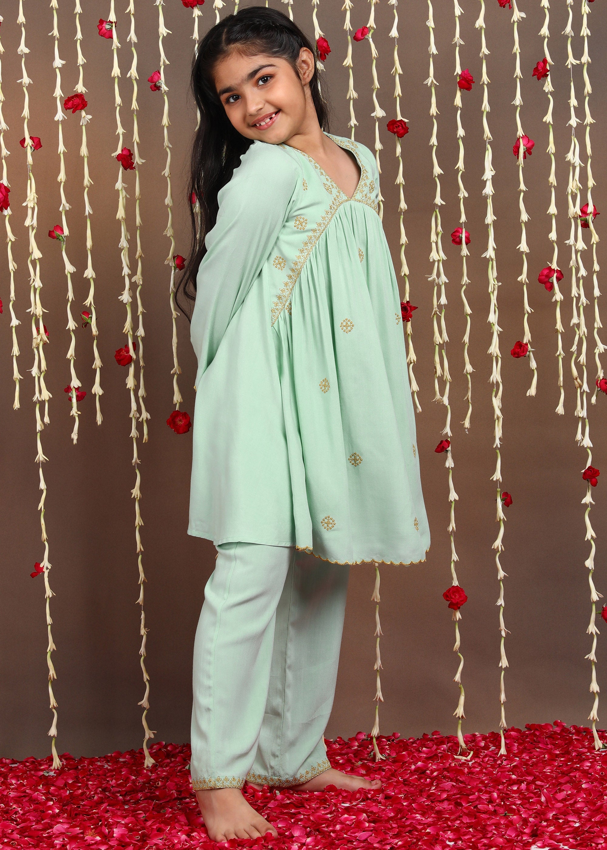 Libra Girls Embroidered Kurta with Trousers- Powder Green