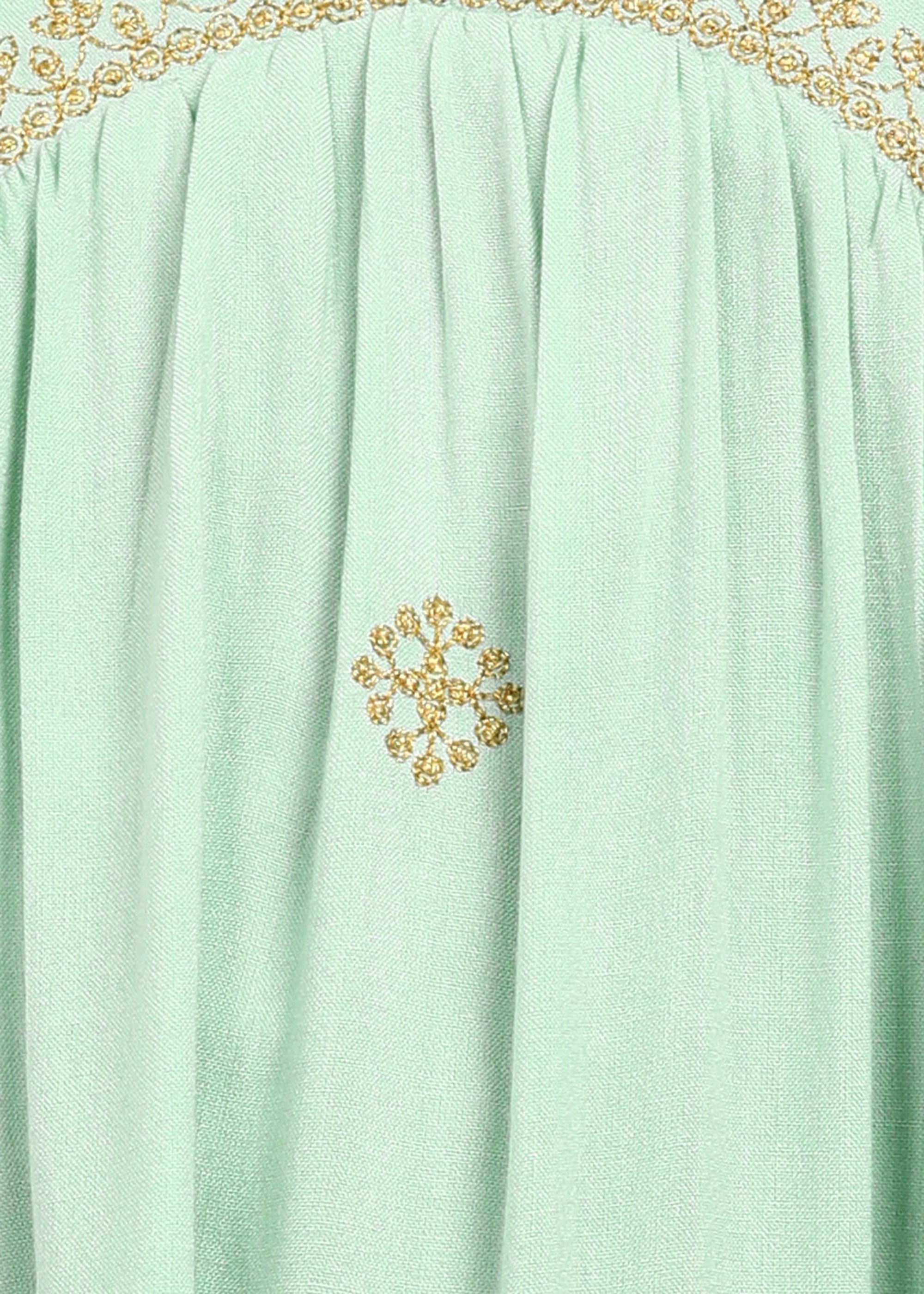 Elevate your little one’s festive look with this Green Floral Embroidered Girls Kurta Set, crafted from soft, breathable rayon for all-day comfort. Featuring delicate floral embroidery, a flowy gathered silhouette, and a graceful V-neckline with subtle lace accents, this lightweight set comes paired with matching embroidered pants—perfect for celebrations, family gatherings, and special occasions.
