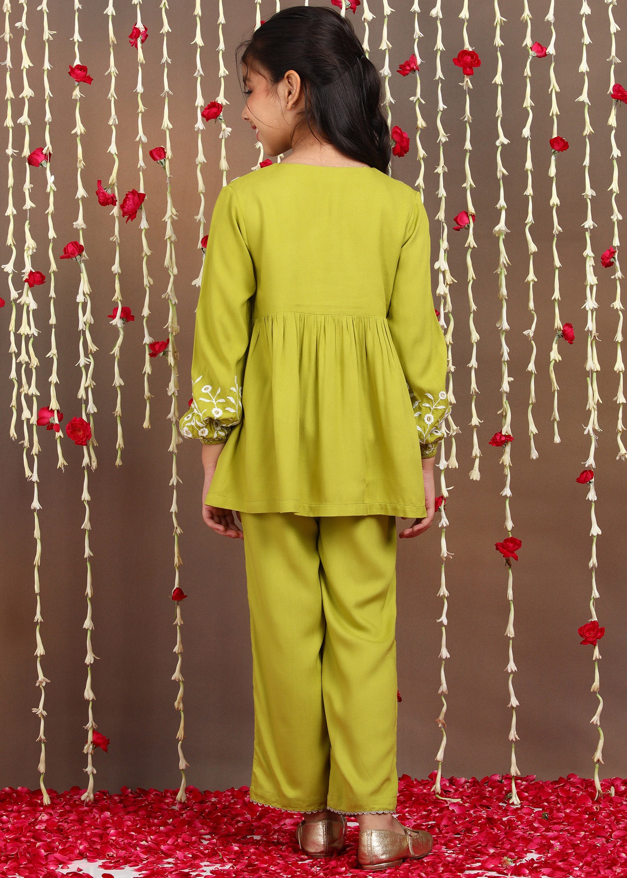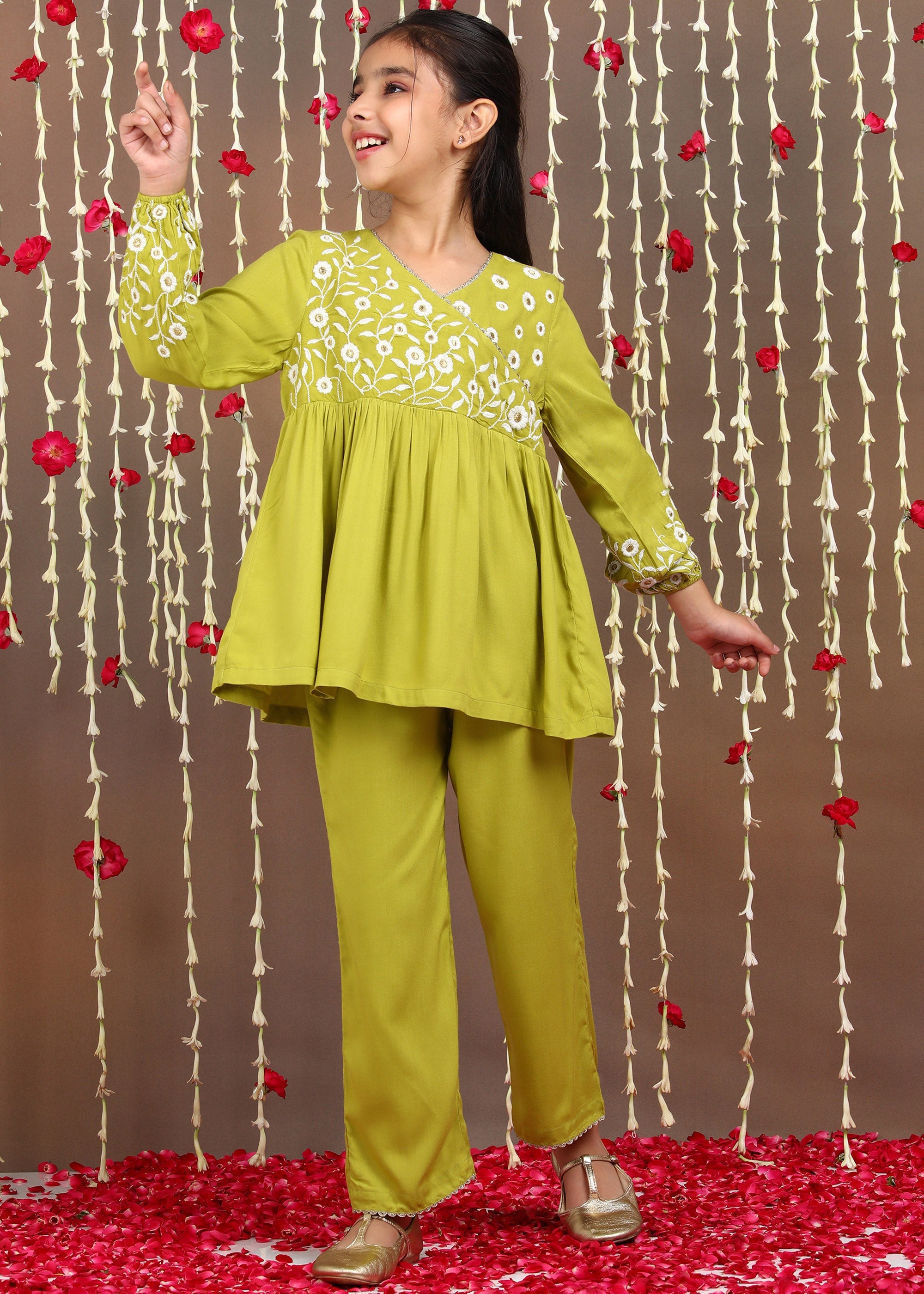 Grace meets comfort in this Floral Embroidered Girls Kurta Set, crafted from soft, breathable rayon that’s gentle on delicate skin. Featuring fine multi-color floral embroidery, a flowy gathered silhouette with an overlap neckline, and matching embroidered straight-fit pants, this lightweight ensemble is perfect for festive celebrations, family functions, and special occasions. ✨