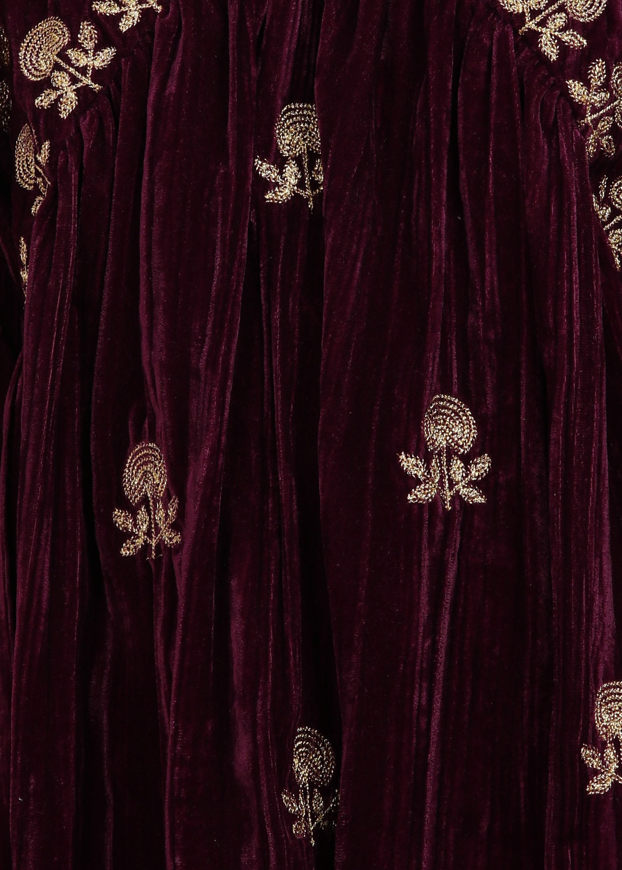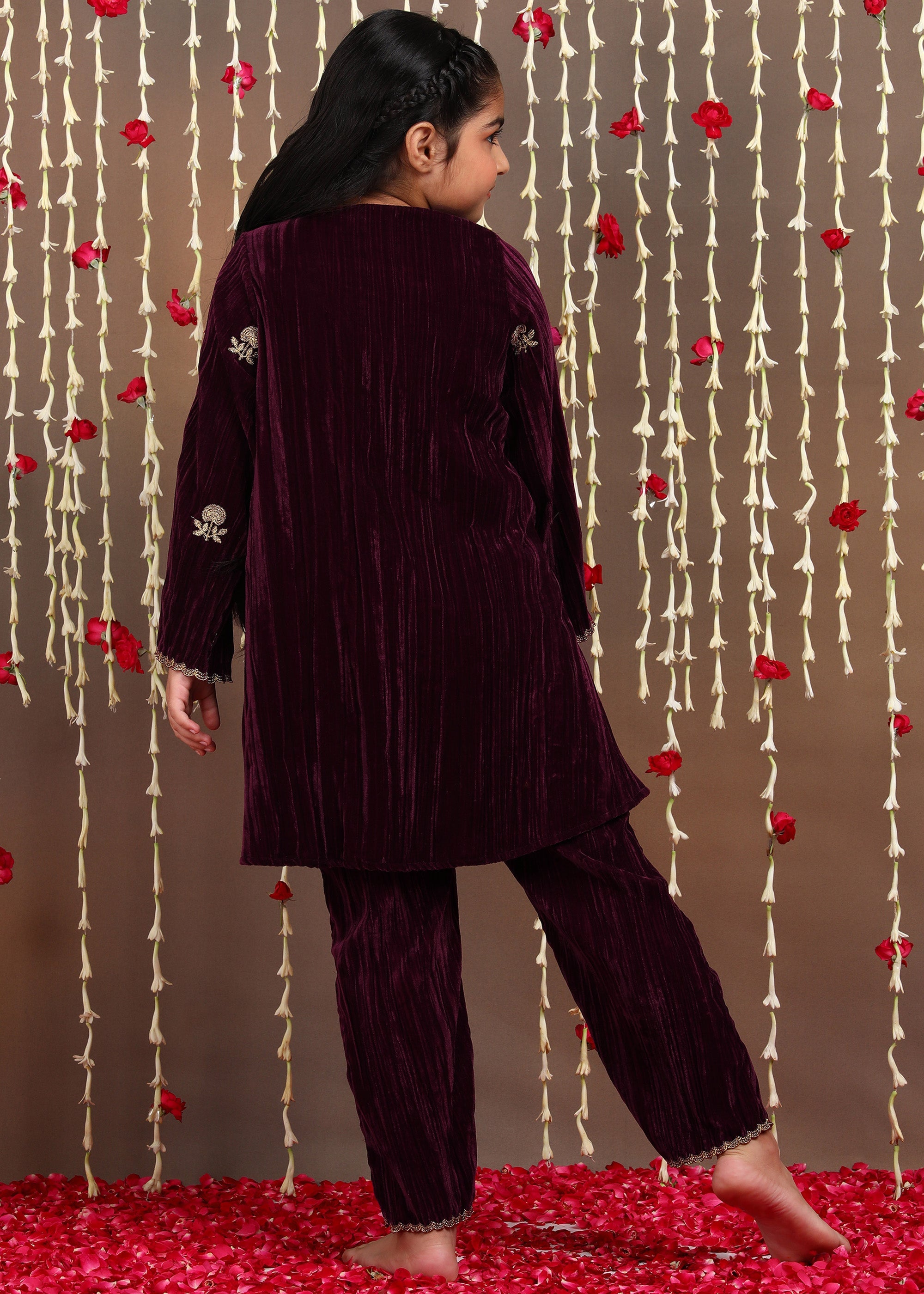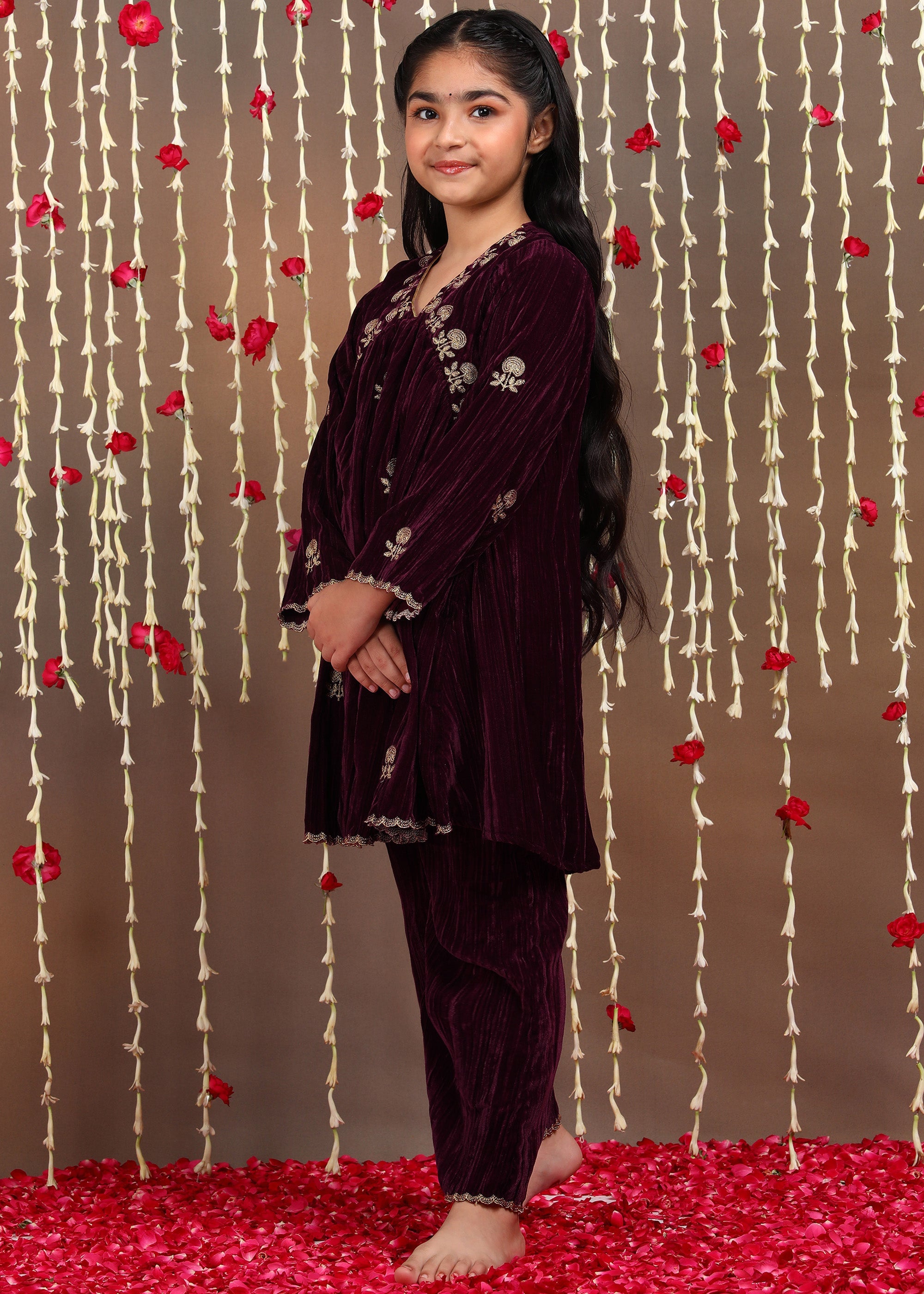 Penny Girls Embroidered Velvet Kurta and Trouser Set - Maroon