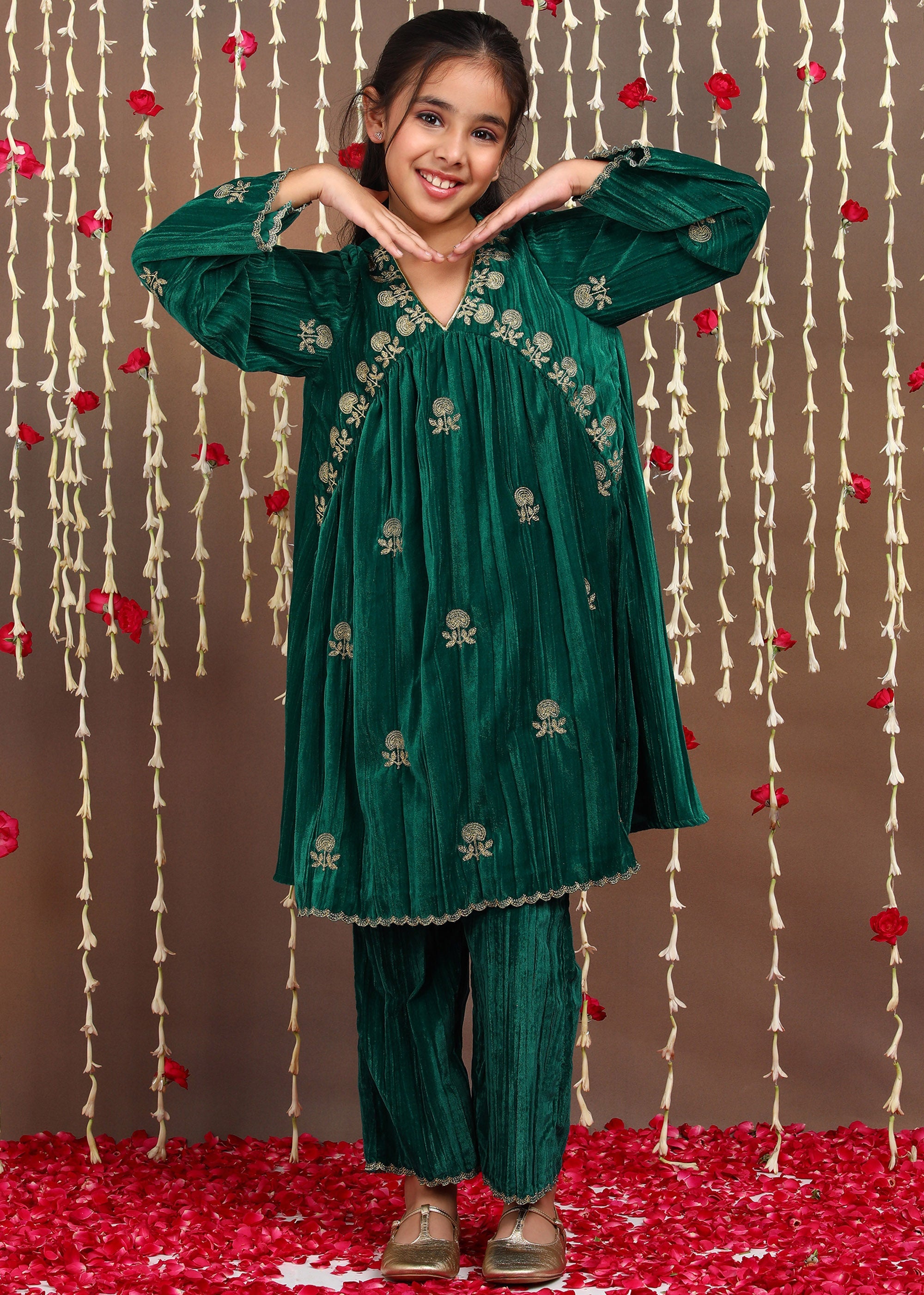 Drape your little princess in the epitome of sophistication with our luxurious velvet Kurta & Trouser Set. This stunning ensemble is designed for the young fashionista who loves to embrace tradition with a contemporary flair. The rich velvet Kurti, adorned with intricate embroidery and delicate zari work, exudes opulence, while the flared pants add a touch of playful charm. The soft, velvety fabric ensures she feels as comfortable as she looks glamorous, making it the perfect outfit for weddings, festive celebrations, or any special occasion.