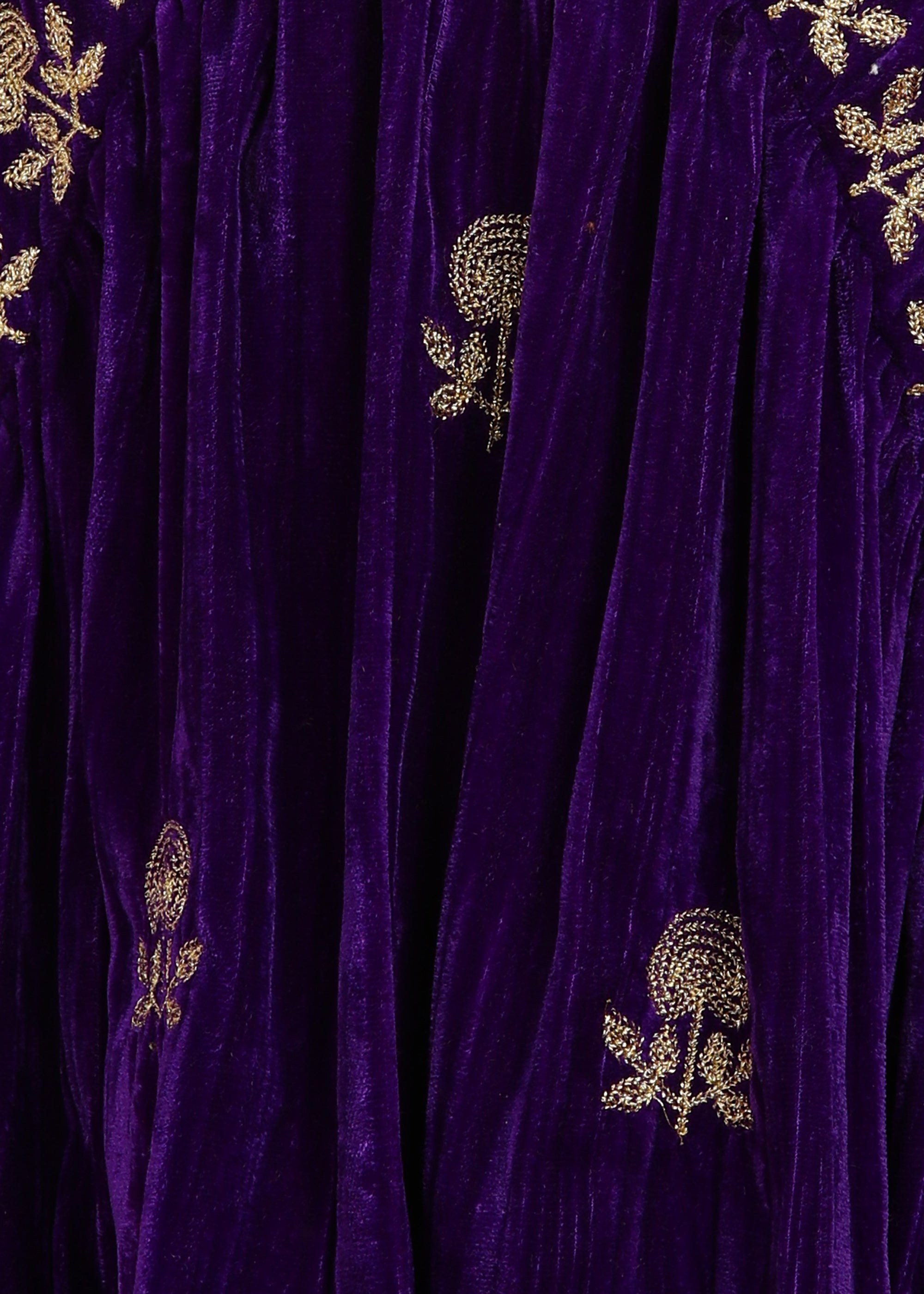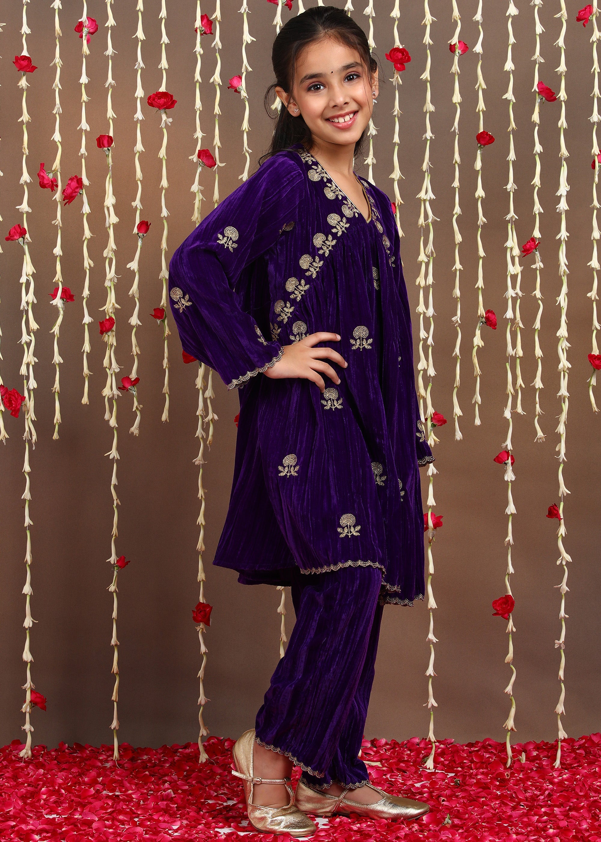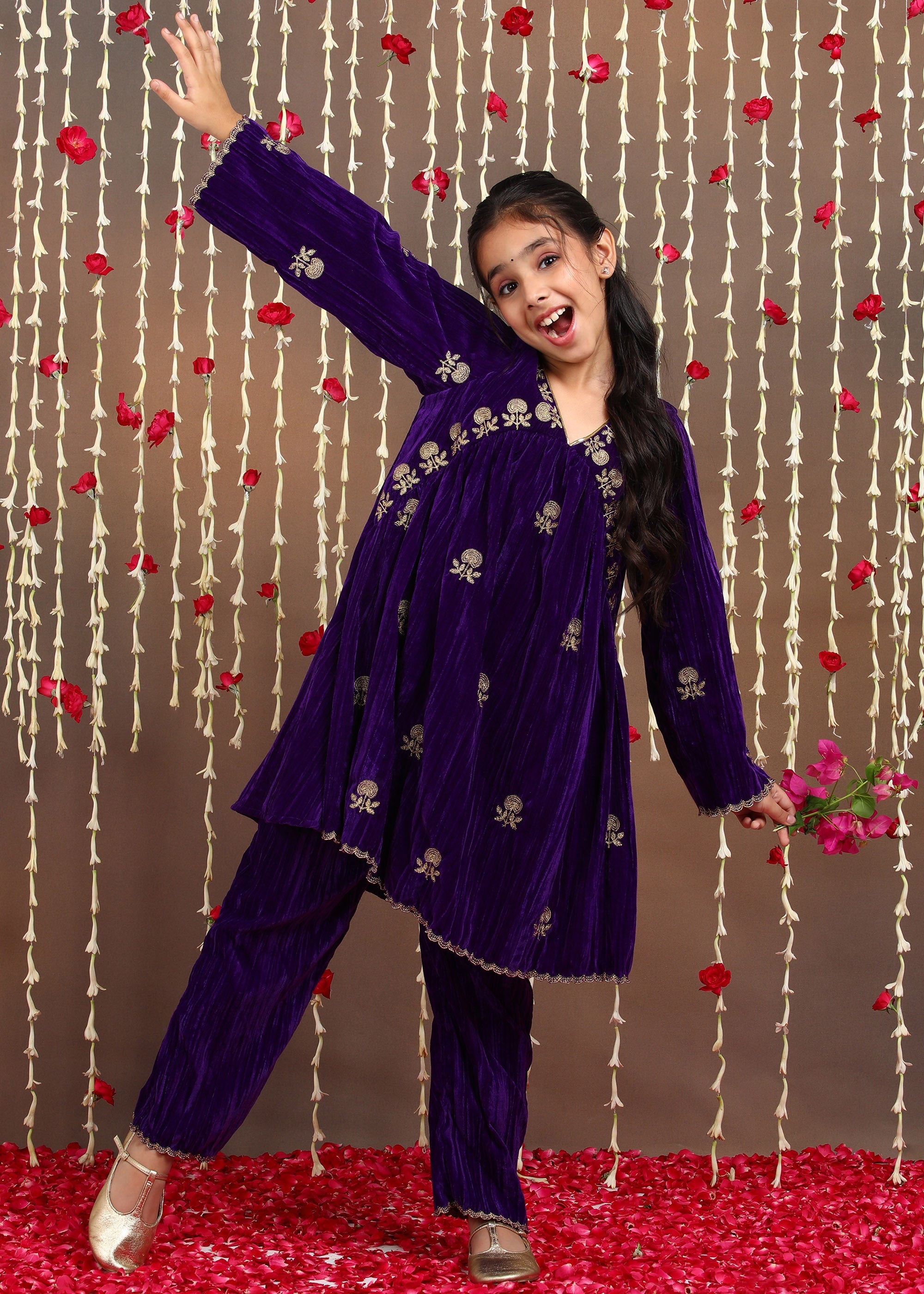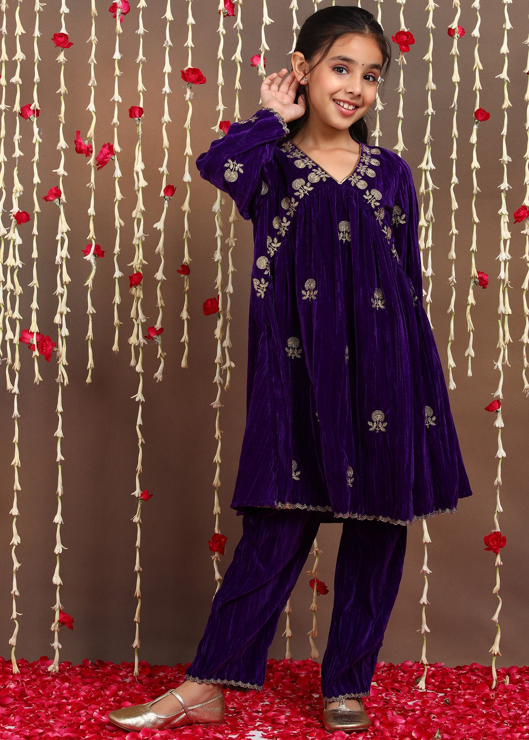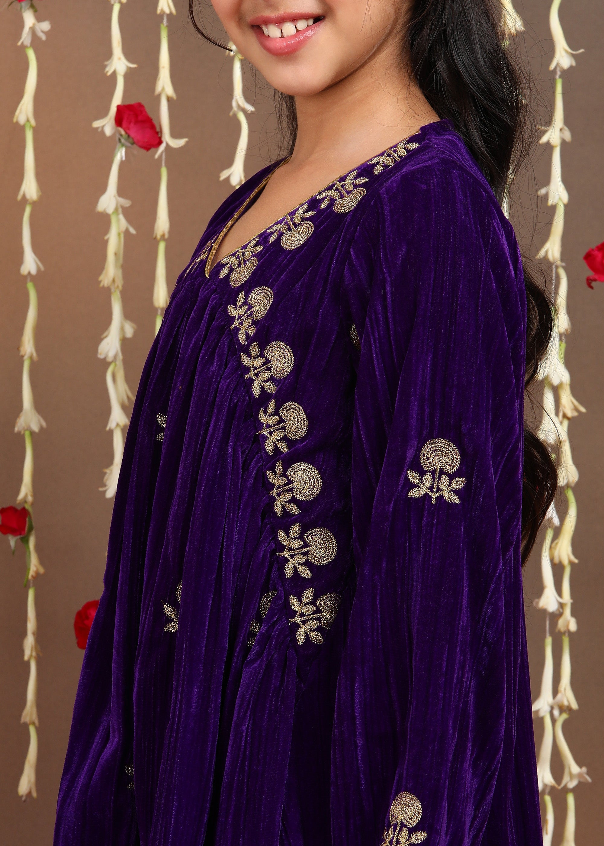 Penny Girls Embroidered Velvet Kurta and Trouser Set - Purple