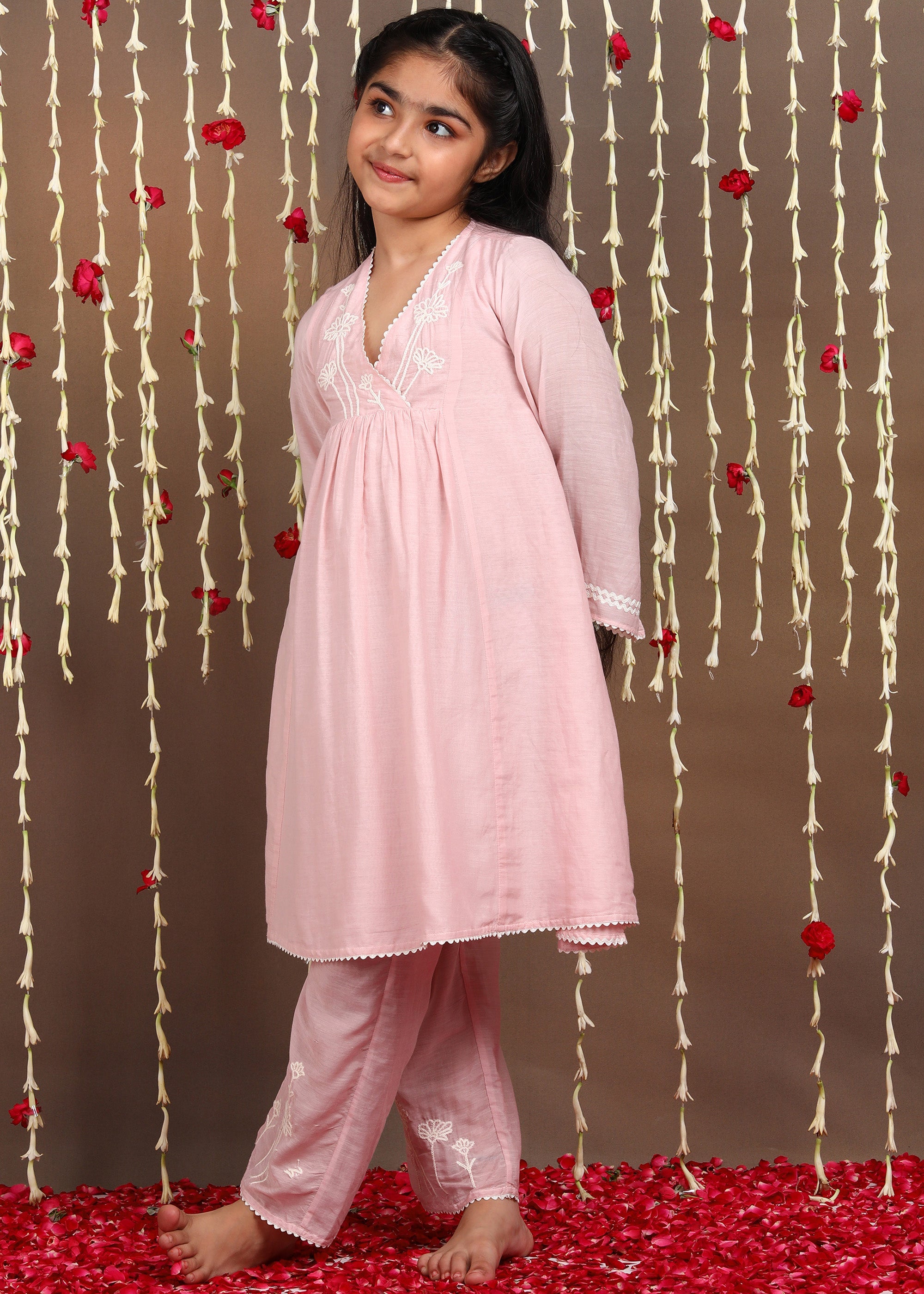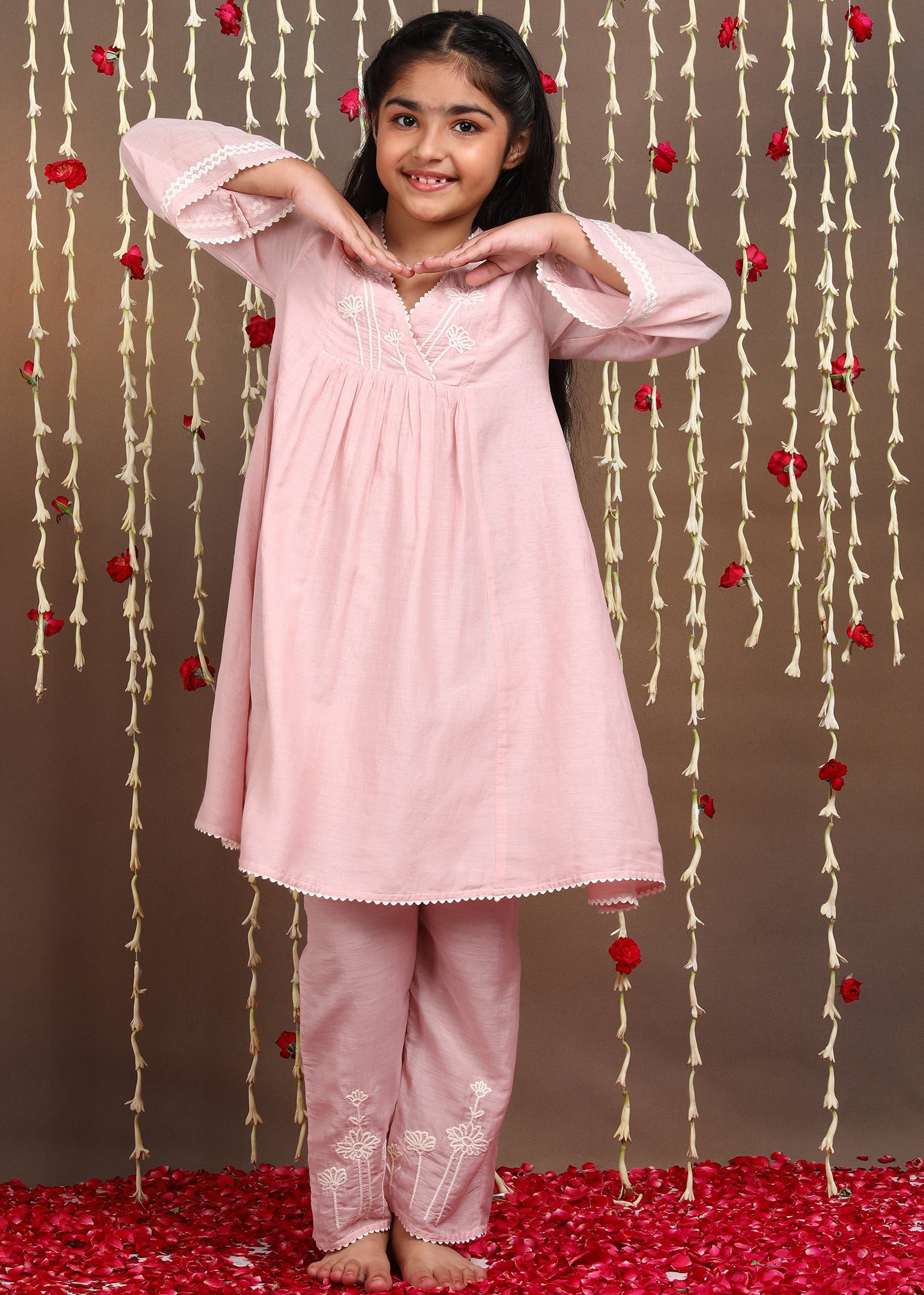 Vanya Girls Embroidered Kurta & Trouser Set - Pink